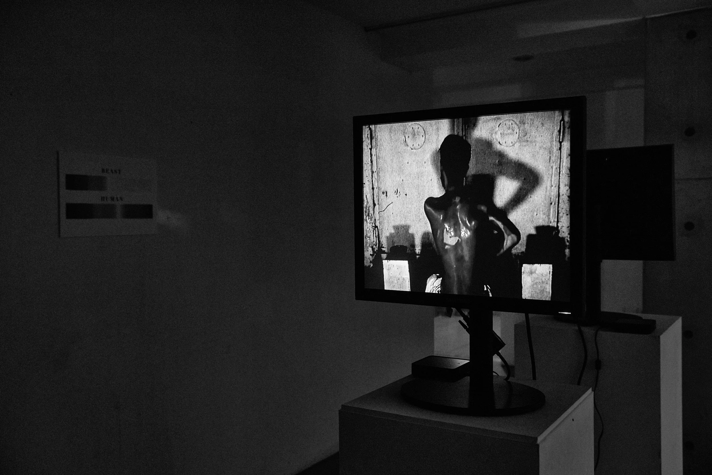 The installation looks at the man and the beast, trapped behind the four lines. The third force. The red in unison before the other thought.