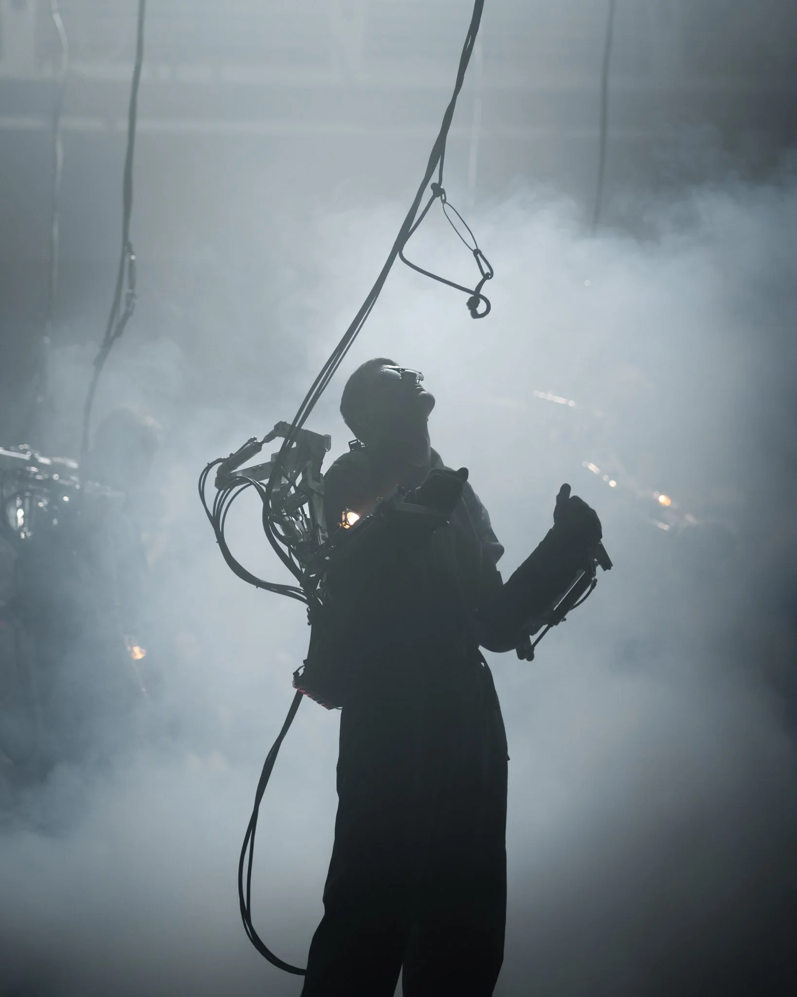 I arrive slightly late and when I enter the space I see the crowd encircles the performance. Inside, humans are locked into robotic exoskeletons which are reminiscent of something out of Halo or Pacific Rim. The suits are attached by a long chord which comes down from the ceiling and there's several of them all dancing to rhythmic electronic music which is being performed by the artists in the booth behind them. I can't quite tell if they are actually controlling their movements or maybe just sending triggers to the suits. Either way it's something mesmerizing to watch and listen to.